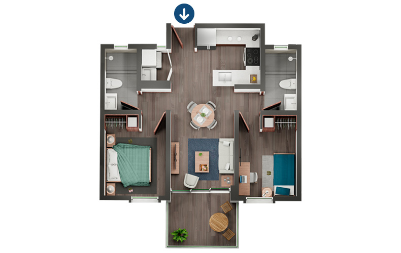 Disfruta de este modelo de apartamento con una sala-comedor, cocina, lavandería, 1 dormitorio secundario, 1 baño compartido, 1 baño principal, 1 dormitorio principal, 1 terraza, 1 parqueo para carro y 1 para moto.